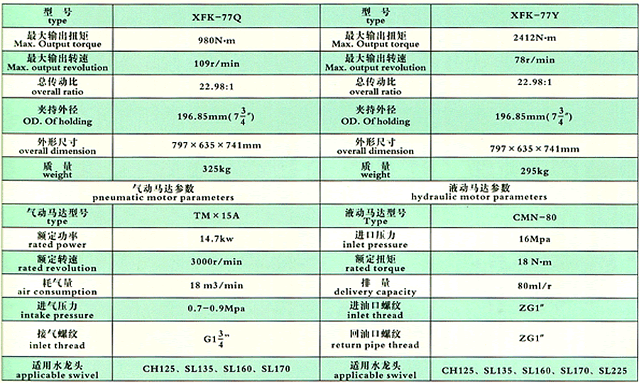 XFK-77Y(Q)型方钻杆旋扣器主要由液压或气动马达、壳体、驱动轴、减速齿轮、主齿圈、棘轮牙嵌、轴承、密封件、制动圈和制动弹簧等部分组成。